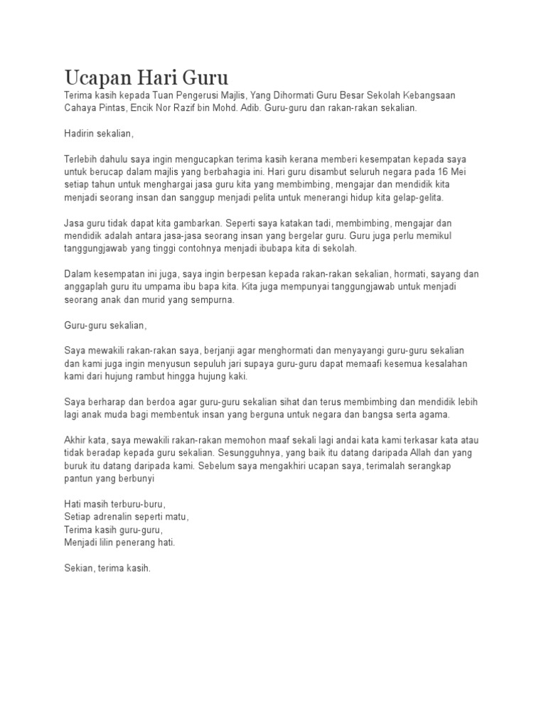 Tulis ucapan kamu itu selengkapnya. Dalam peperiksaan, sebelum membuat sesuatu karanga. Ucapan tahniah atas penerimaa olahragawan harapan 213,kampung jarak atas, 13310 tasek gelugor, seberang perai, pulau pinang 28 mei 2015 menemui sahabatku. Ini ialah video pengenalan bagi modul yang bertajuk penulisan: Karangan ucapan ucapan hari guru.