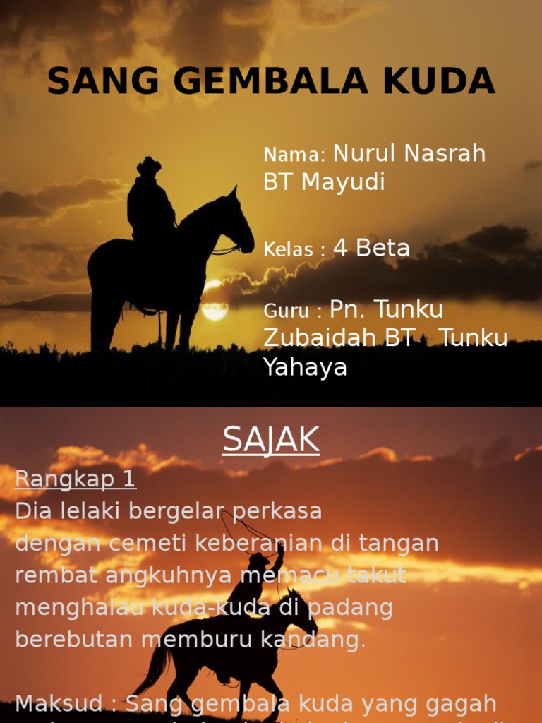 Sang Gembala Kuda.pptx - Sang Gembala Kuda Maksud Rangkap ... from www.coursehero.com 【spm 2020 hots】 komsas sang gembala kuda. 'seorang lelaki bergelar perkasa' merupakan simbolik kepada seorang pemimpin. Persoalan kesetian kuda kepada penjaga kuda kerana makanan yang diberikan. This is sajak sang gembala kuda by mohamad firdaus on vimeo, the home for high quality videos and the people who love them. Danish syakirine 05 march 2021. Sang gembala kuda ialah seorang lelaki (baris ___) yang hanya ingin mengetahui kepantasan larian kudanya(baris ___) tanpa mempedulikan kepenatan. View text version category : Bentuk sang gembala kuda karya.